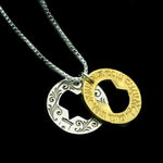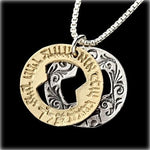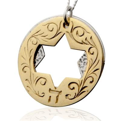 This Kabbalah pendant is a truly unique piece. The two part, 9K gold and silver, beautifully form an inner Star of David. The round disc is Hebrew engraved with a verse from the powerful Jewish prayer Ana Bekoach. Also inscribed in one of the 72 Names of God  : The three letter combination in Hebrew, Alef-Lamed-Dalet is used by the Kabbalah to ward off the Evil Eye and bring good fortune.
