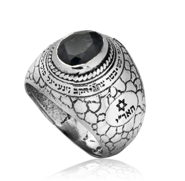 This unique Jewish Kabbalah ring features beautiful decorations on sterling silver. Set with an Onyx gemstone, the ring is entirely handmade by the craftsmen of HaAri Jewelry. The stunning ring is inscribed in Hebrew with three-letter combinations that comprise Ana Bekoach. The prayer Ana BeKoach was written in the first century by the great Kabbalist, Rabbi Nehumia Ben Hakannah, according to the 42 names of God. This powerful Jewish prayer is believed to draw divine protection and blessing. This powerful blessing is believed to draw divine protection and blessing and lead for a breakthrough in life.