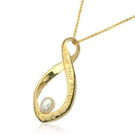 Shaped as infinity, the gold pendant is inlaid with pearl.