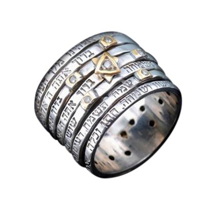 This wide Jewish ring is composed of thinner rings wrapped together to symbolize the spiritual bond between two people. It is a spinner ring with five thin bands at the center that rotate. Made of silver, the ring is set with diamonds.