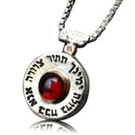 Set with a garnet stone, this beautiful Kabbalah pendant is made from sterling silver. It is also features the five metals.