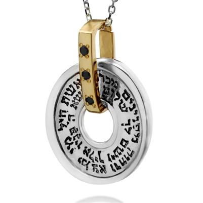 Designed as an ancient coin, this extraordinary pendant is made of silver and 14 K gold and set with diamonds. The pendant is engraved with two famous blessings in Jewish tradition.