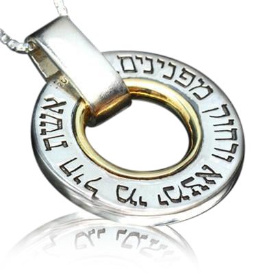 This beautiful pendant is a wonderful gift for the woman in your life. Made of sterling silver and 9K gold, the pendant is inscribed in Hebrew with a portion of the song Woman of Valor (Eshet Chayil): "She opens her mouth with wisdom and a lesson of kindness is on her tongue".