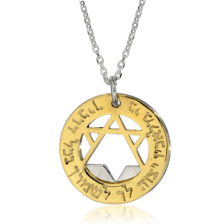 Take a closer look at this beautiful Star of David pendant! This circular pendant features two parts, silver and 9K gold that form an inner Star of David. The Star of David, also known by its Hebrew name, Magen David, is the most recognizable sign of Jewish identity. Comprised of two symmetrical triangles that create a hexagram, the Star of David is widely known as a powerful protective amulet that fights negative energies.