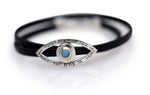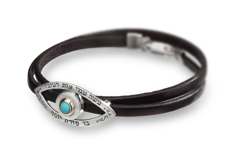 Made from leather, the silver part is inlaid with a Turquoise gem, creating the kind eye motif. The kind eye refers to the positive energies that shield a person from any evil.