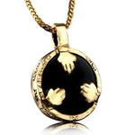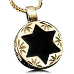 This Star of David pendant is made of 9k gold with an onyx gem at its heart. The reverse side of the pendant is decorated with three 9 K Gold Hamsa hands.