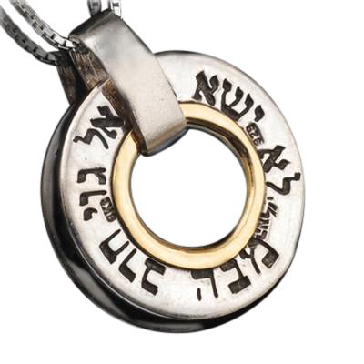 This unique Kabbalah pendant is made of sterling silver. The inner ring is made of 9K Gold. Both sides of the pendant are engraved with a three-letter sequence in Hebrew that spells one of the 72 names of God along with the corresponding psalms from traditional texts.