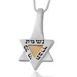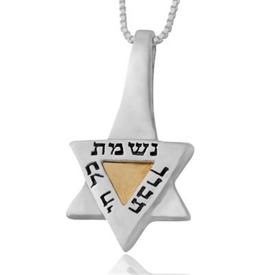 Made of sterling silver band 9K gold this Star of David pendant a true artwork. This extraordinary Kabbalah pendant is inscribed in Hebrew with a verse from the Jewish prayer Nishmat Kol Chai: " Bless the soul of every living being ".