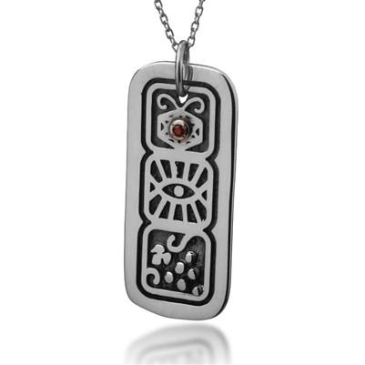 Made from silver and set with a garnet stone, this beautiful disc pendant is entirely handmade.