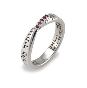 This beautiful Kabbalah ring is specially designed for the brides to be. Made from sterling silver, the ring is set with 5 Ruby stones which give the item its beautiful appearance. The Kabbalah ring is Hebrew inscribed with a famous verse from the book Song of Songs, written by King Solomon: "Thy lips, O my bride, drop honey--honey and milk are under thy tongue; and the smell of thy garments is like the smell of Lebanon:" The Kabbalah ring is a unique charm which holds a special 'segula' for matchmaking and fertility.