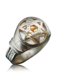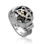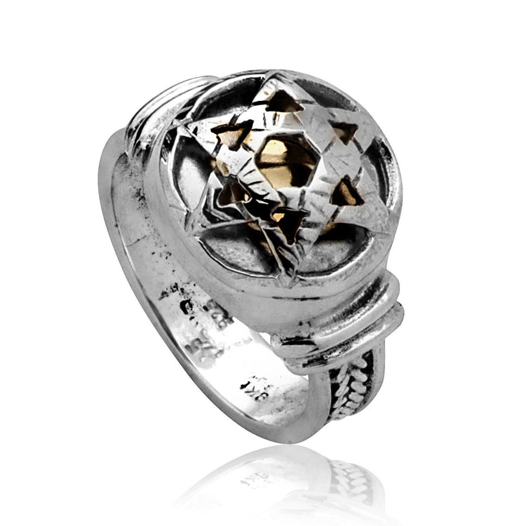 This extraordinary Star of David ring comes from our exclusive collection of handcrafted Jewish jewelry. Made from silver, the piece features the five elements formula.  In the Kabbalah, the five metals jewelry is considered to be a powerful tool for bringing a about positive changes in our lives. The blending of the five metals: Gold, Silver, Copper, Tin and Lead draws on powerful energies.