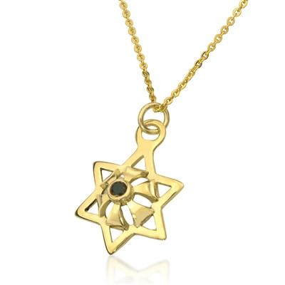 The Star of David is formed by six segments beautifully linked together. The Star of David in this design symbolically connects the material world of man with the spiritual one. Set with a black diamond stone at its heart, the pendant is made of Gold.