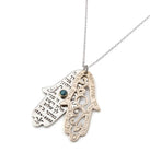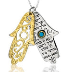 This Hamsa pendant is made of two Hamsa hand designs, one is from silver, and the other from 9K Gold. Along the delicate gold Hamsa engraved in Hebrew "Ben Porat Yoseph Alei Ayne". The Silver Hamsa is beautifully inscribed in Hebrew with the Priestly Blessing (Birkat HaKohanim). At the heart of the Hamsa is a Turquoise gem. The Hamsa hand is an ancient amulet that is believed to fight the envious eye and negative energies.